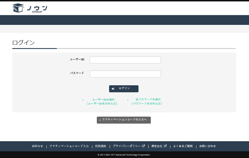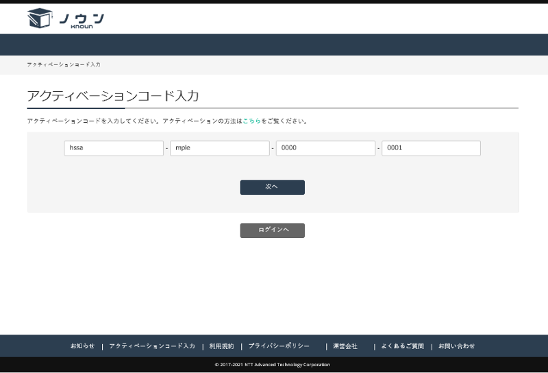 PCのWebブラウザで https://knoun.jp/activate を開いてください。 「アクティベーションコード入力」画面が開きますのでアクティベーションコード入力欄に
