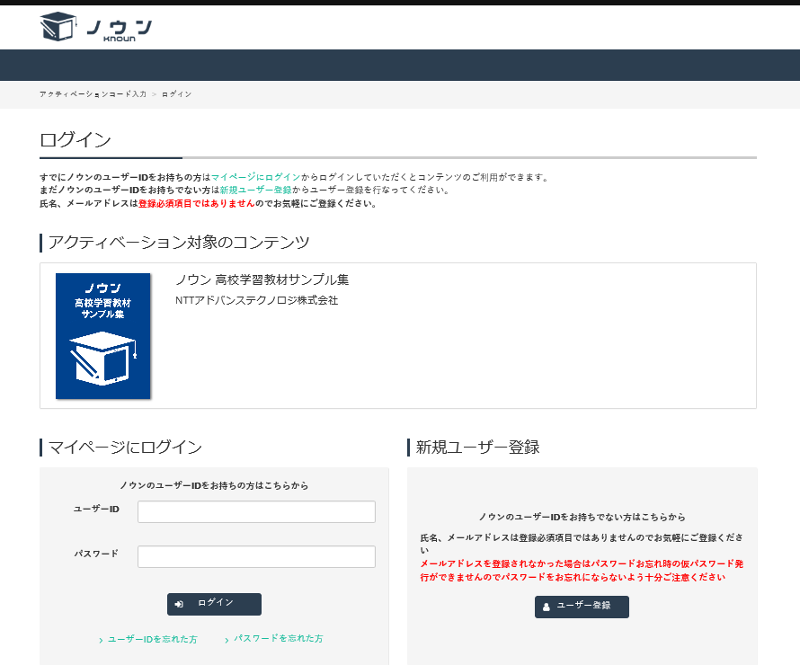 サンプル教材の情報と「マイページにログイン」「新規ユーザー登録」が表示されます。